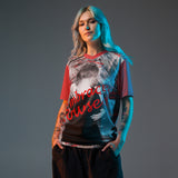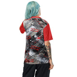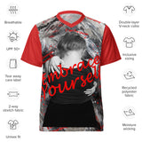 Introducing our revolutionary sports jersey crafted with recycled materials for a sustainable future. Designed with breathability and moisture-wicking properties, it ensures you stay cool and dry during intense workouts or when you wear it for the day. The two-way stretch fabric provides flexibility and freedom of movement, while the double-layered v-neck collar adds a touch of style. With a trendy and unique vibrant print, this jersey not only looks great but also feels comfortable, empowering you to achieve your best performance. Pair with any of I'm's matching apparel, athletic wear, swimwear, footwear, bags and accessories and take your fashion to the next level!